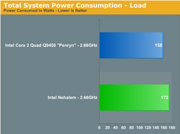 Nehalem处理器像Penryn一样采用的是45纳米制程工艺,我们预测Nehalem处理器的能耗比Penryn要高,如果英特尔公司的目标是每个微体系架构性能提升1%,而能耗不超过1%的话,这个结论也是可能的:即性能如果提升20-50%,系统能耗总量上升10%。